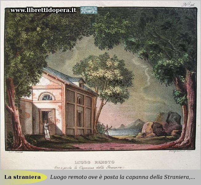Luogo remoto ove è posta la capanna della Straniera, ombreggiata da piante silvestri; di prospetto s'innalzano alcune rupi, a' piedi delle quali è il lago. | ![]() |