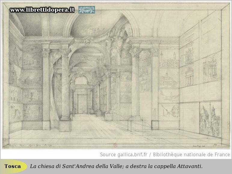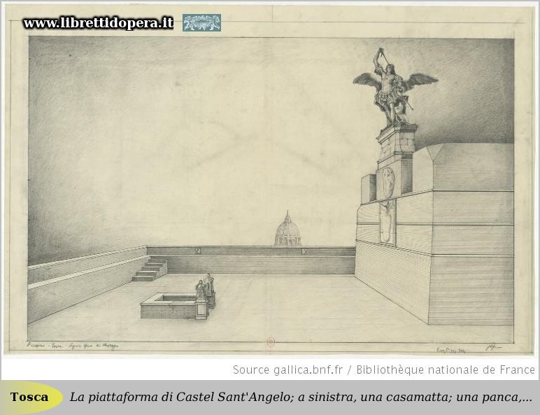 La piattaforma di Castel Sant'Angelo; a sinistra, una casamatta; una panca, una sedia; a destra, l'apertura di una piccola scala; notte. | ![]() |